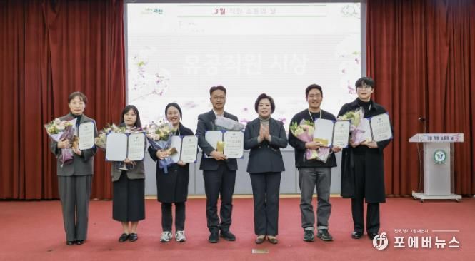장려상은 주택과 조윤주 공동주택팀장, 자치행정과 조인길 정무비서, 도로건설과 이승구 건설행정팀장, 공원녹지과 김현중·김우진 주무관과 정수미 정원도시팀장이 수상했다. 이들은 주암지구 신혼희망타운 과천시민 우선 공급 확정, 주차면 확보 및 부설주차장 개방 지원 조례 마련, 노후공원 재정비 등 시민 생활과 밀접한 분야에서 적극행정을 통해 실질적인 변화를 이끌어낸 공로를 인정받았다.