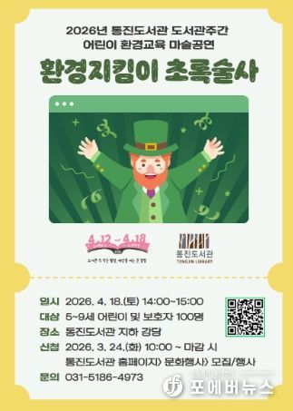 ‘환경지킴이 초록술사’ 공연은 4월 18일 오후 2시부터 3시까지 통진도서관 지하 강당에서 진행된다. 대상은 5~9세 어린이 및 보호자 100명이다. 참여를 원할 경우 3월 24일 오전 10시부터 통진도서관 누리집에서 신청하면 된다.