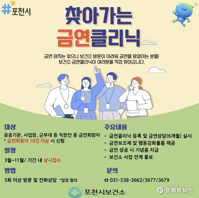 [ 포에버뉴스 김경순 기자 ] 포천시는 지역사회 흡연율 감소 및 시민 건강증진을 위하여 공공기관, 사업장, 군부대 등을 대상으로 ‘찾아가는 금연클리닉’ 참여 기관을 모집한다고 밝혔다.