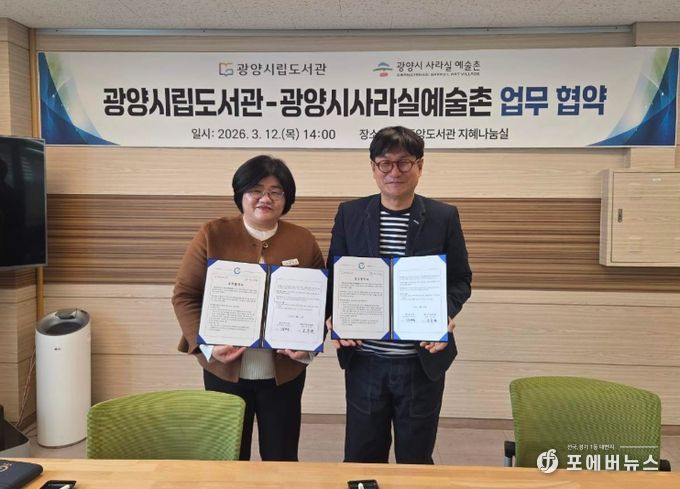 [ 포에버뉴스 오명숙 기자 ] 광양시립도서관과 광양시사라실예술촌은 지난 3월 12일 오후 2시 광양중앙도서관에서 시민의 문화예술 향유 기회를 넓히고 지역 문화기관 간 협력 기반을 강화하기 위한 업무협약을 체결했다.