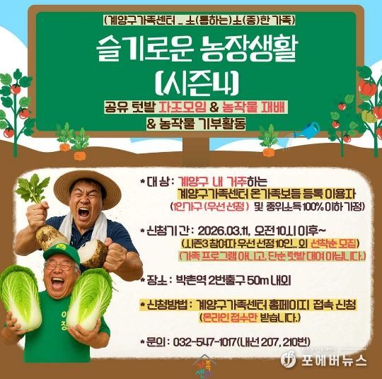 [ 포에버뉴스 김경순 기자 ] 인천 계양구가족센터(센터장 권도국)는 지역 내 1인가구 및 취약가구를 대상으로 3월 28일부터 공유 텃밭 프로그램 ‘슬기로운 농장생활 시즌4’를 진행할 예정이다.