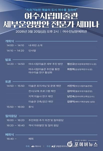 [ 포에버뉴스 오명숙 기자 ] 여수시는 오는 3월 20일 오후 2시 진남문예회관에서 ‘여수시립미술관 건립 세부운영방안 전문가 토론회(세미나)’를 개최한다고 밝혔다.