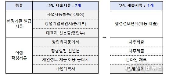 행정정보 연결로 사업자등록증, 재무제표 등 행정서류는 자동수집한다. 개인정보제공동의서 등은 온라인 체크로 대체한다. 또한, 기업 심사에 불필요한 서류는 폐지하거나 선정된 기업만 제출한다. 사업계획서 제한 분량도 평균 14장에서 9.4장까지 30% 이상 감축할 계획이다.