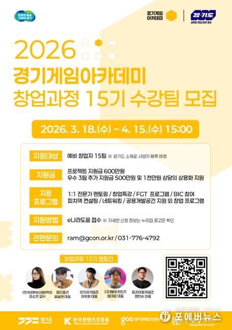 [ 포에버뉴스 김경순 기자 ] 경기도와 경기콘텐츠진흥원이 대한민국 게임산업의 미래를 이끌어갈 ‘2026 경기게임아카데미’ 창업과정 15기 수강생을 4월 15일까지 모집한다.
