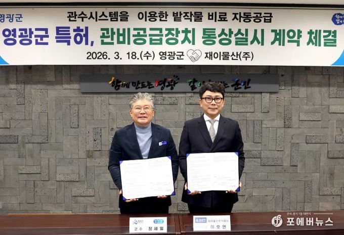 [ 포에버뉴스 오명숙 기자 ] 영광군은 지난 18일 전북 군산시에 위치한 재이물산(주)과 ‘관비공급장치’ 특허에 대한 통상실시권 계약을 체결했다고 밝혔다.