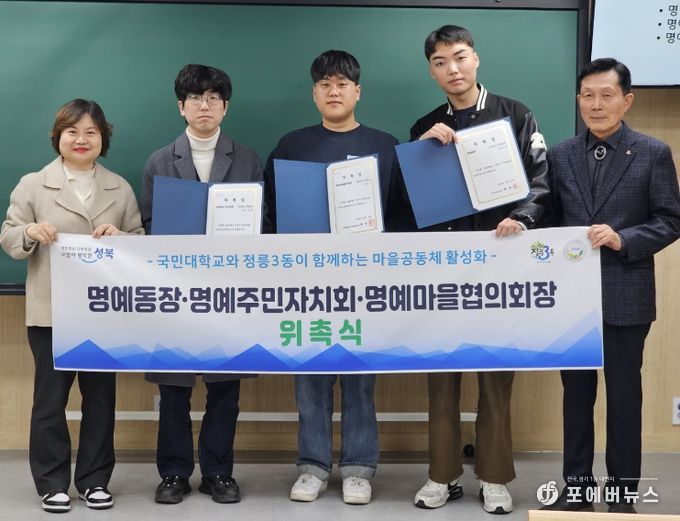 [ 포에버뉴스 김경순 기자 ] 서울 성북구 정릉3동주민센터가 지난 3월 17일 사랑교회에서 제9기 명예단체장 위촉식을 열고 국민대학교 학생 3명을 명예동장, 명예주민자치회장, 명예마을협의회장으로 각각 위촉했다.
