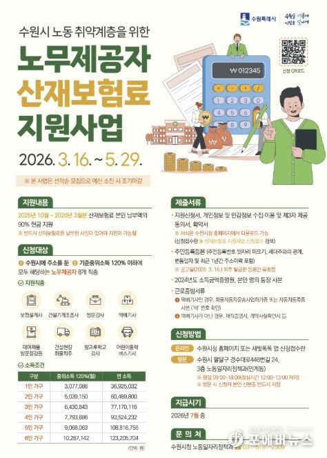 [ 포에버뉴스 김경순 기자 ] 수원특례시는 5월 29일까지 ‘2026년 상반기 노동 취약계층 노무제공자 산재보험료 지원사업’ 신청을 받는다.