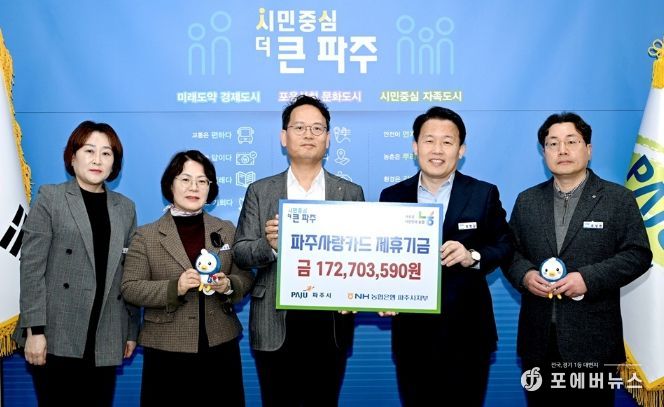 [ 포에버뉴스 김경순 기자 ] 파주시는 지난 18일 엔에이치(NH)농협은행 파주시지부로부터 지난해 적립된 제휴카드 적립기금 172,703,590원을 전달받았다.