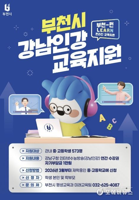 [ 포에버뉴스 김경순 기자 ] 부천시는 2026년 ‘부천-런(Learn) 온라인 교육지원’ 사업을 추진한다고 19일 밝혔다. 이는 지난해에 이어 시행되는 것으로, 관내 중·고등학생들에게 온라인 교육 기회를 제공하고 가정의 사교육비 부담을 완화하는 데 중점을 둔다.