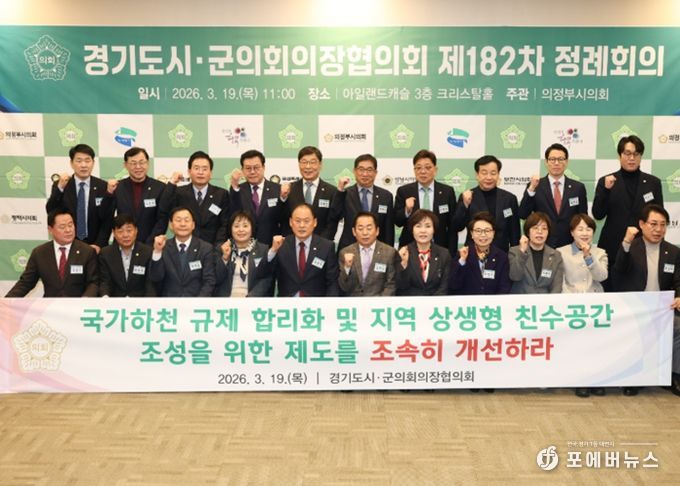[ 포에버뉴스 김경순 기자 ] 경기도시군의회의장협의회 회장인 동두천시의회 김승호 의장이 제안한 '국가하천 규제 합리화 및 지역 상생형 친수공간 조성을 위한 제도 개선 촉구 건의안'이 19일 의정부 아일랜드캐슬에서 열린 제182차 정례회의에서 만장일치로 채택됐다.