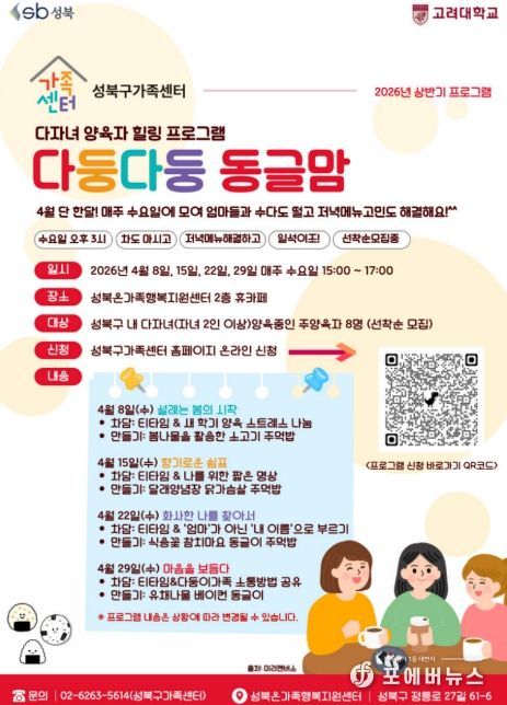 이승로 성북구청장은 “다자녀 양육자들이 서로 공감하고 응원할 수 있는 돌봄공동체 형성에 도움이 되길 바란다”며 “앞으로도 다양한 가족 유형을 지원하는 프로그램을 지속적으로 운영하겠다”고 말했다.