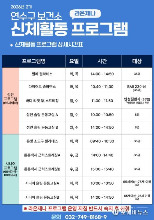 연수구보건소 관계자는 “이번 프로그램은 구민이 일상에서 꾸준히 신체활동을 실천할 수 있도록 돕기 위한 건강증진 사업”이라며 “앞으로도 다양한 운동 프로그램을 통해 구민들의 건강한 생활을 적극 지원하겠다.”라고 말했다.