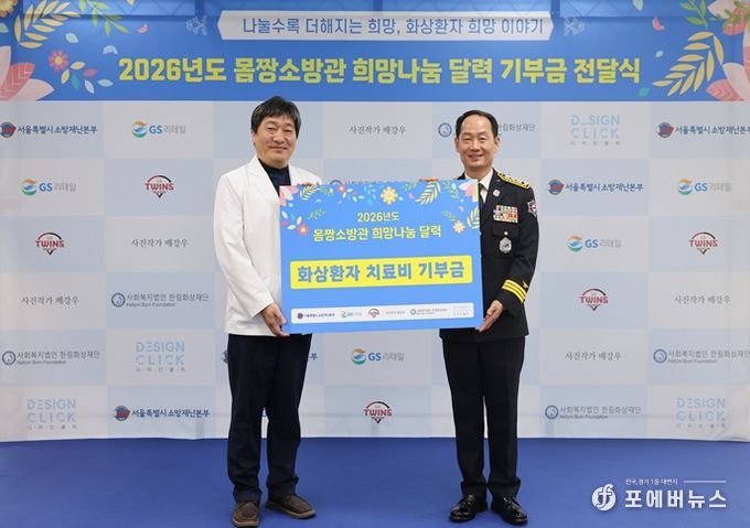 이번 전달식은 ‘2026년 몸짱소방관 희망나눔 달력 프로젝트’를 통해 마련된 판매 수익금에 GS리테일, LG트윈스 등 민간기업의 기부금을 더해 화상환자 지원기관인 한림화상재단에 전달하는 방식으로 진행됐다.