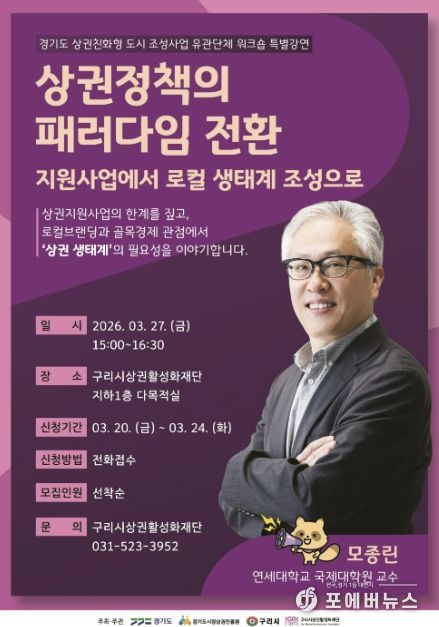 [ 포에버뉴스 김경순 기자 ] 구리시상권활성화재단은 지역 상권의 지속 가능한 발전과 지역 경쟁력 강화를 위해 모종린 교수를 초청해 ‘상권 정책의 패러다임 전환’을 주제로 오는 3월 27일 특별 강연을 개최한다.