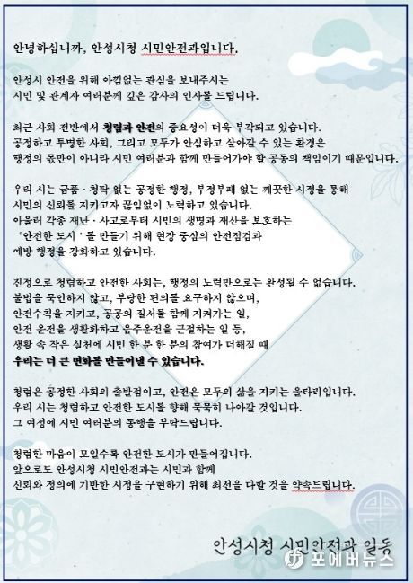[ 포에버뉴스 김경순 기자 ] 안성시는 각종 안전점검 과정에서 청렴 안내문을 배부하는 ‘청렴한 안전점검’을 추진하며 시민 청렴의식 제고에 나선다.