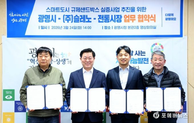 시는 24일 오후 시청 영상회의실에서 ‘스마트도시 규제샌드박스 실증사업’ 추진을 위해 사업 수행기관인 ㈜슬레노와 사업 대상지인 광명전통시장과 광명새마을시장의 4자 간 업무협약(MOU)을 체결했다.