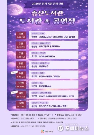[ 포에버뉴스 김경순 기자 ] 화성시문화관광재단 송산도서관은 오는 4월부터 12월까지 지역 주민들에게 풍요로운 문화 체험의 기회를 제공하는 연간 상설 공연 프로그램 '도서관 속 공연장'을 운영한다.