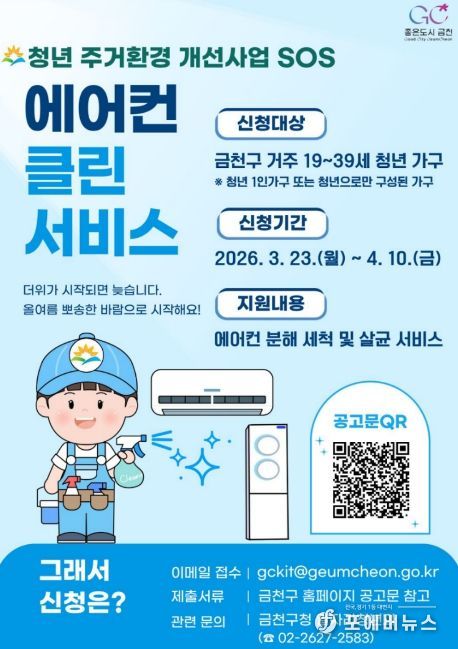 [ 포에버뉴스 김경순 기자 ] 금천구는 여름철을 앞두고 청년가구의 쾌적한 생활환경 조성을 위해 ‘에어컨 클린서비스’ 사업을 추진한다고 밝혔다.