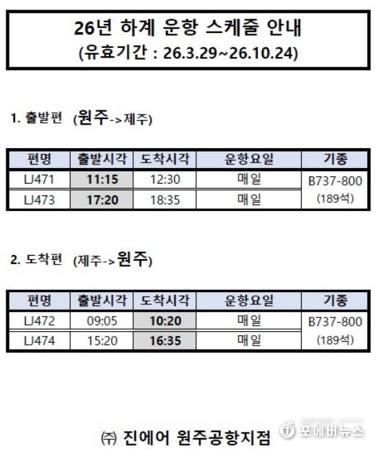 [ 포에버뉴스 방미정 기자 ] 원주공항의 2026년 하계(3월 29일∼10월 24일) 제주 항공편이 동계와 같이 오전·오후 시간대 편성으로 유지된다.