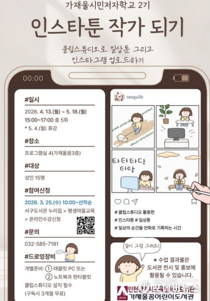[ 포에버뉴스 김경순 기자 ] 인천광역시교육청서구도서관은 지역 주민의 창작 활동을 지원하기 위해, 25일부터 가재울 시민저자학교 2기 프로그램인 ‘인스타툰 작가되기’ 참여자를 모집한다.