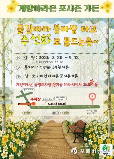 [ 포에버뉴스 김경순 기자 ] 인천광역시 계양구는 봄을 맞아 계양아라온 일대에 대규모 꽃 식재를 완료하고, 포시즌가든을 중심으로 수선화가 개화하기 시작하며 화사한 봄 경관을 선보이고 있다고 밝혔다.