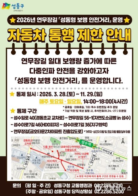 특히, 올해는 운영 시간을 지난해(오후 1시~5시)보다 1시간 늦춘 오후 2시부터 6시까지로 조정했다. 이는 지난해 운영 과정에서 파악된 방문객 집중 시간대를 반영한 조치다. 운영 구간은 기존과 동일하며, ▲ 성수일로 40(경동초교 교차로) ~ 연무장길 56-1(자연도소금빵 in 성수), ▲ 성수이로7길 46(HDD피자) ~ 성수이로7길 36(지구화학), ▲ 연무장길(금호타운2차 아파트 진출입도로) 구간이 대상이다.