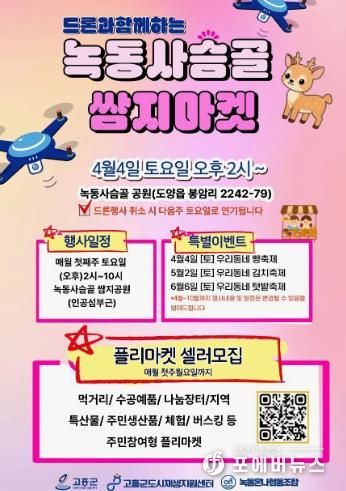 [ 포에버뉴스 오명숙 기자 ] 고흥군은 오는 4월 4일 녹동항 드론쇼 개막식과 연계해 도양읍 쌈지소공원에서 도시재생사업 일환으로 ‘녹동 사슴골 쌈지마켓’을 개최한다고 밝혔다.