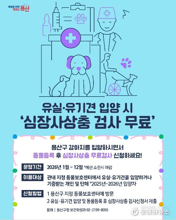 지원 대상은 2025~2026년 중 용산구 관내 지정 동물보호센터에서 유실·유기견을 입양하거나 기증받는 개인 및 단체다. 동물보호센터에 검사신청서를 제출하면 심장사상충 검사를 1회 무료로 받을 수 있다. 구가 검사비 전액을 부담하며, 사업은 예산 소진 시까지 진행된다.