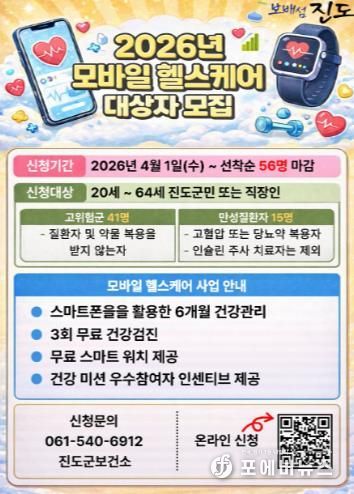 [ 포에버뉴스 오명숙 기자 ] 진도군보건소는 4월 1일부터 ‘2026년 모바일 헬스케어 2기’ 대상자 56명을 선착순으로 모집하고 있다.