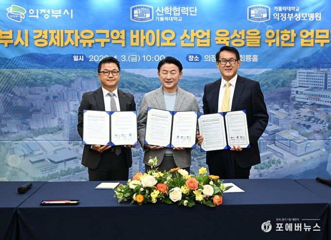 [ 포에버뉴스 김경순 기자 ] 의정부시는 4월 3일 시청 회룡홀에서 가톨릭대학교 의정부성모병원, 가톨릭대학교 산학협력단과 함께 ‘의정부시 경제자유구역 바이오 산업 육성을 위한 업무협약’을 체결했다.