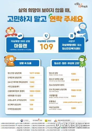 또한 3월부터 5월까지 자살 고위험 시기를 맞아 전 시군과 함께 생명존중 캠페인, 홍보활동을 집중 추진하고, 필요시 누구나 상담받도록 자살예방 상담전화 109와 정신건강 상담전화 1577-0199 안내를 강화한다.