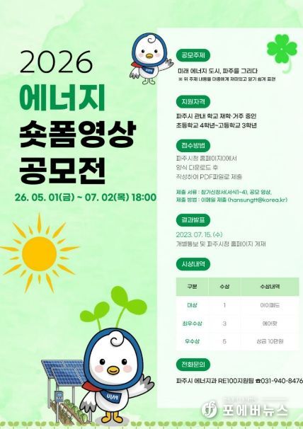 [ 포에버뉴스 김경순 기자 ] 파주시는 청소년들의 에너지 인식을 제고하고 디지털 미디어 활용 역량을 강화하기 위해 녪년 파주시 청소년 에너지 숏폼 영상 공모전’을 개최한다.