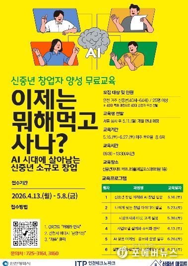 [ 포에버뉴스 김경순 기자 ] 인천광역시가 추진하고 인천테크노파크(인천TP)가 운영하는 ‘신중년아지트’는 오늘부터 인천 신중년(40~64세)을 대상으로 ‘AI 기반 소규모 창업 교육’ 참여자를 모집한다고 밝혔다.