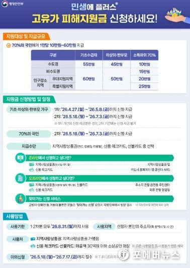 이어 2차 신청 대상자인 소득 하위 70%(약 13만 명 추산)에게도 10만 원을 지급해 유가 상승으로 인한 물가 부담을 전방위적으로 완화할 계획이다.