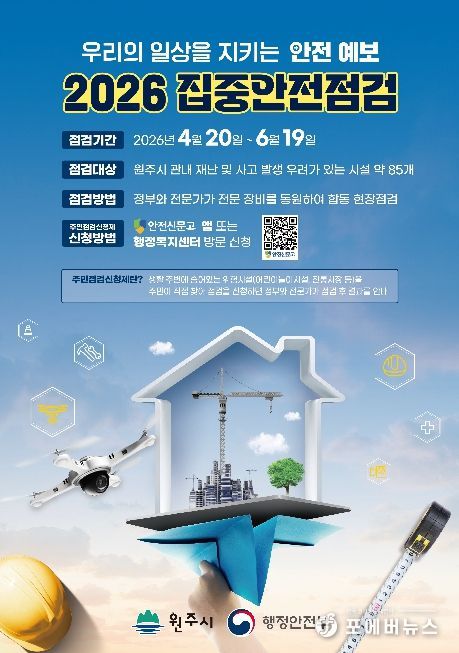 [ 포에버뉴스 방미정 기자 ] 원주시는 4월 20일부터 6월 19일까지 61일간 ‘2026년 집중안전점검’을 추진한다.