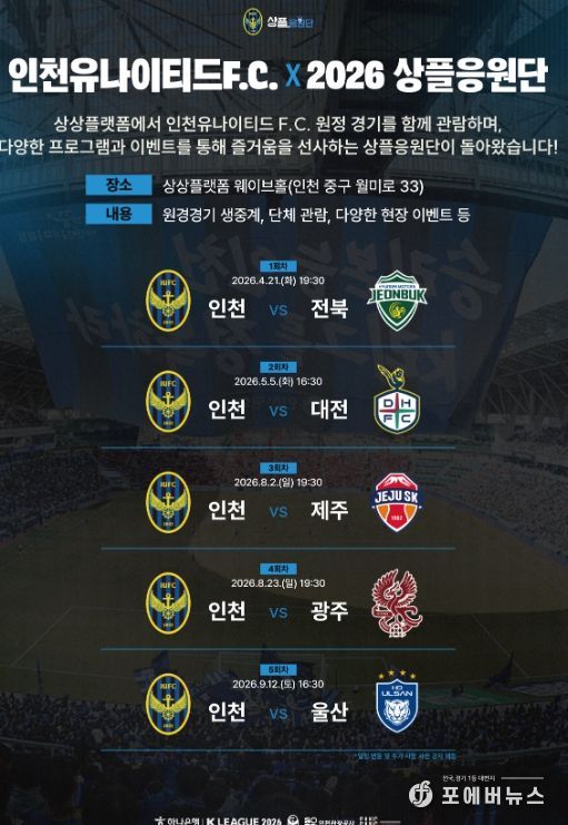 [ 포에버뉴스 김경순 기자 ] 인천관광공사는 인천유나이티드와 함께 ‘인천유나이티드F.C. X 2026 상플응원단’을 공동 개최한다고 밝혔다.