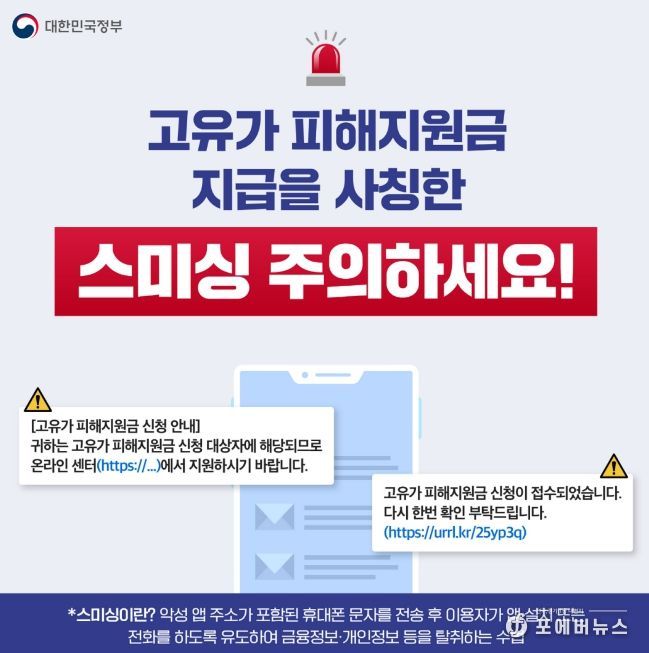 지원금 지급 시기에는 ‘지원 대상자 선정’, ‘고유가 지원금 수령 안내’ 등 신청을 유도하는 가짜 문자가 기승을 부린다. 이러한 문자에 포함된 인터넷 주소(URL)을 클릭하면 악성 앱이 설치되어 스마트폰 내 개인정보나 금융정보가 탈취될 위험이 크다.