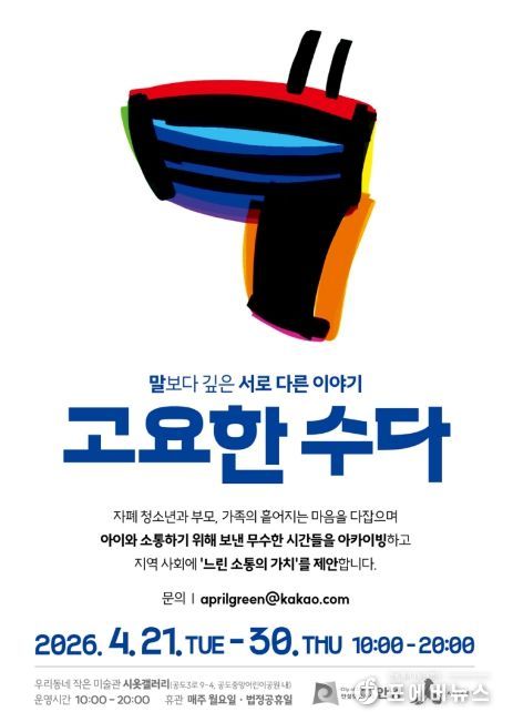 [ 포에버뉴스 김경순 기자 ] 안성시 시옷갤러리는 오는 4월 21일부터 4월 30일까지 자폐 청소년과 그 가족이 함께 참여하는 전시 《고요한 수다》를 개최한다고 밝혔다.