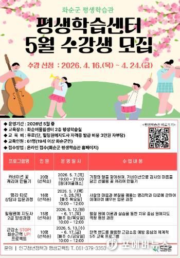 [ 포에버뉴스 오명숙 기자 ] 화순군은 찾아가는 전남형 평생학습 공모사업과 연계해 군민의 자기계발과 건강한 여가 활동 지원을 위해 ‘5월 평생학습센터 프로그램’ 수강생을 모집한다고 밝혔다.
