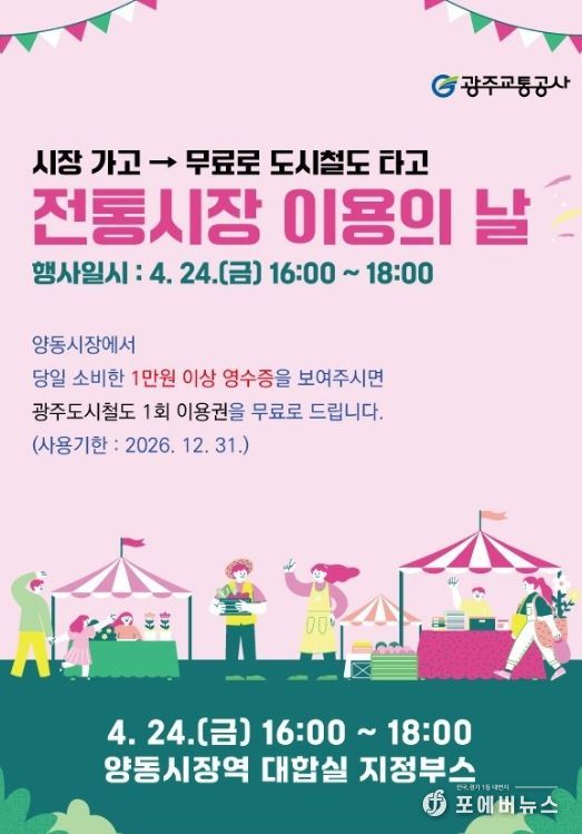이번 행사는 양동전통시장의 대표 행사인 ‘제4회 양동통맥축제’와 연계해 진행되며, 공사는 4월 24일 오후 4시부터 6시까지 행사 당일 양동시장에서 1만원 이상 구매한 고객에게 도시철도 1회 무료 이용권을 증정한다.