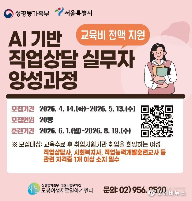 [ 포에버뉴스 김경순 기자 ] 서울 도봉구가 도봉여성센터에서 ‘AI 기반 직업상담 실무자 양성과정’을 운영한다고 밝혔다. 대상은 직업상담사, 사회복지사, 직업능력개발훈련교사 등의 자격증을 소지하고, 취업지원 분야로 취업을 희망하는 여성 구직자다.