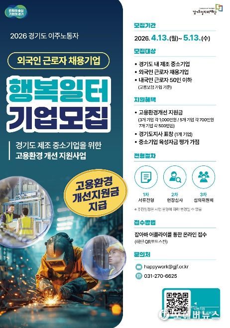 [ 포에버뉴스 김경순 기자 ] 경기도와 경기도일자리재단은 도내 외국인 근로자를 고용한 중소 제조기업을 대상으로 ‘2026년 경기도 이주노동자 행복일터 선정사업’ 참여기업을 모집한다고 20일 밝혔다.