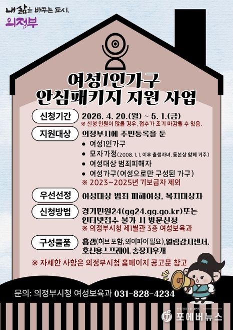 [ 포에버뉴스 김경순 기자 ] 의정부시는 4월 20일부터 5월 1일까지 12일간 온․오프라인을 통해 여성 1인 가구 안심패키지 지원사업의 신청을 접수한다.