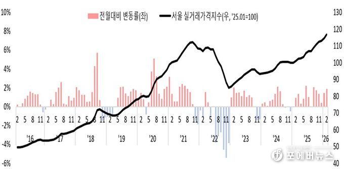 한편, 한국부동산원이 매주 조사·공표하는 주간 아파트 가격지수는 2월 당시 상승세가 점차 둔화되는 모습을 보였으나, 2월 실거래 전수를 기반으로 산출한 실거래가격지수는 오히려 1월 대비 상승폭이 확대된 것으로 나타나 두 지수 간 상이한 흐름이 확인됐다.