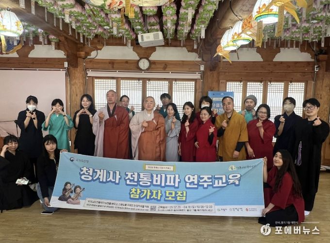 국가유산청의 ‘전통산사 국가유산 활용 공모 사업’으로 진행된 ‘신중도 속 비파천인들’은 청계사 극락보전 내 신중도(경기도 유형문화유산)에서 볼 수 있는 우리나라 전통악기 ‘비파’를 배우는 연주자 양성 교육으로, 2022년부터 올해까지 총 56명의 수료생을 배출했다.