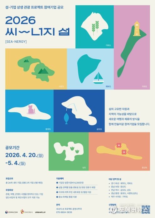 [ 포에버뉴스 사공선 기자 ] 문화체육관광부가 주최하고 한국관광공사가 주관한 2026년 씨너지『섬-기업 상생 관광프로젝트』 참여기업 공모를 오는 4월 20일 월요일 부터 5월 4일 월요일까지 모집한다.