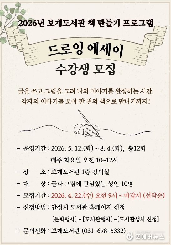 [ 포에버뉴스 김경순 기자 ] 안성시 보개도서관(책문화센터)이 시민들의 창작 활동을 지원하고 일상 속 예술 경험을 확대하기 위해 오는 5월부터 ‘드로잉 에세이’와 ‘포토 에세이’ 책 만들기 프로그램을 새롭게 운영한다고 밝혔다.
