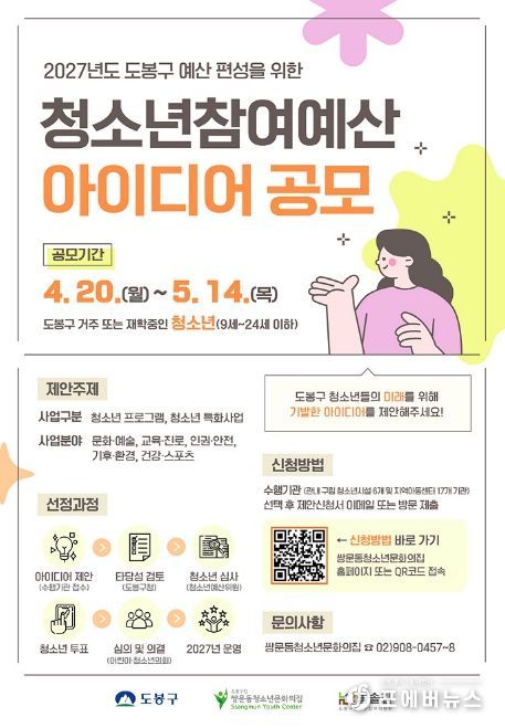 [ 포에버뉴스 김경순 기자 ] 서울 도봉구가 ‘청소년참여예산제’ 아이디어 공모를 오는 5월 14일까지 진행한다.