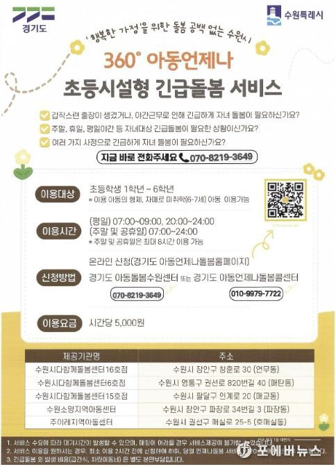‘초등시설형 긴급돌봄 서비스’는 갑자기 아동 돌봄이 필요할 때 요긴하다. 예상하지 못했던 출장이나 야근으로 퇴근이 예정보다 늦어지는 경우와 같은 돌발 상황에 모두 이용할 수 있다. 주말이나 휴일, 자정까지의 야간 시간 등은 물론 등교 전인 오전 7시부터 서비스를 제공한다. 장안구 2곳(연무동, 파장동), 권선구 1곳(호매실동), 팔달구 1곳(매교동), 영통구 1곳(매탄동) 등 총 5개 돌봄 기관에서 최대 8시간을 맡아준다. 경기도 아동언제나돌봄 홈페이지에서 온라인 신청할 수 있고, 경기도아동돌봄수원센터에 전화 신청할 수도 있다. 이용요금은 시간당 5천원이다.