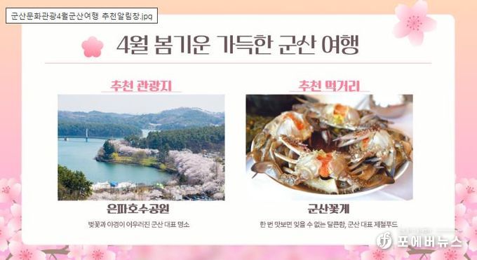 [ 포에버뉴스 이승훈 기자 ] 군산시는 계절과 시기에 맞는 관광 정보를 한눈에 제공하는 ‘월별 추천 콘텐츠 알림창 서비스’를 오는 5월부터 본격 운영한다고 밝혔다.